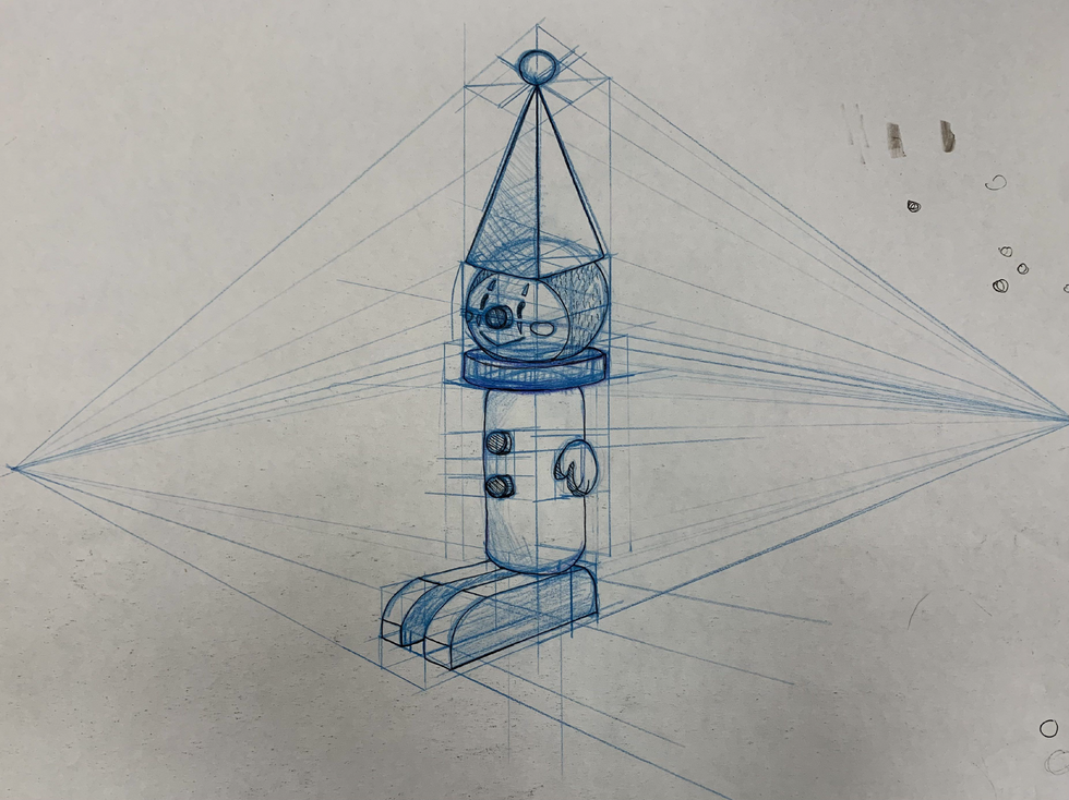 Rendered drawing of wooden clown peg toy design. Done in pencil crayon and alcohol markers on bond paper.